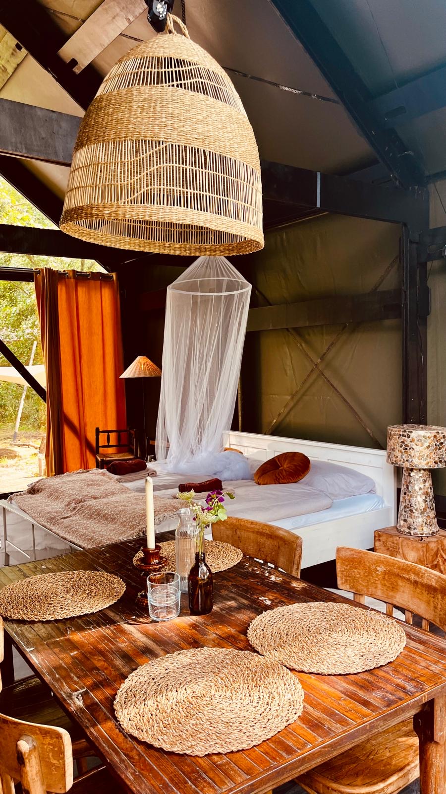 Dit is een twee persoonshuisje die wat meer minimalistisch is ingericht maar wel met de fijne warme TW sfeer van veel rotan, hout en ingetogen comfort. Er is een tweepersoons bed met ons heerlijke beddengoed, een tafel met stoelen, nespresso apparaat, waterkoker en een lekkere luie stoel met leeslamp. Ook bij dit tent huisje maak je gebruik van ons sanitairhuisje. Hier kan ook weer makkelijk een babybedje bijgeplaatst worden.